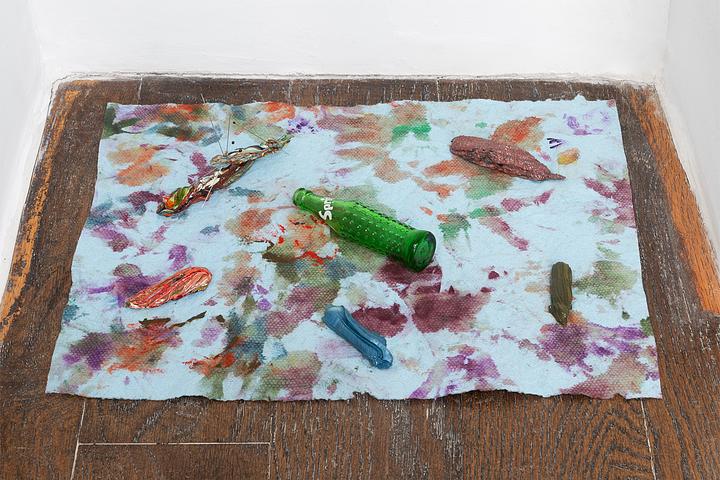 Blue shop towel, enamel residue, cleaning solvent, oil paint, stainless steel insect pins, miniature glass Sprite bottle